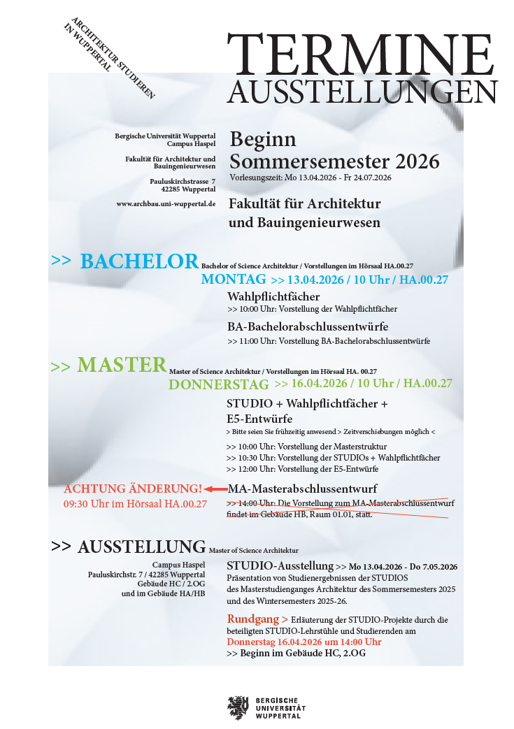 Termine: STUDIO/Wahlpflichtfächer/E5 Entwürfe & Ausstellungen Architektur // Achtung Änderung!