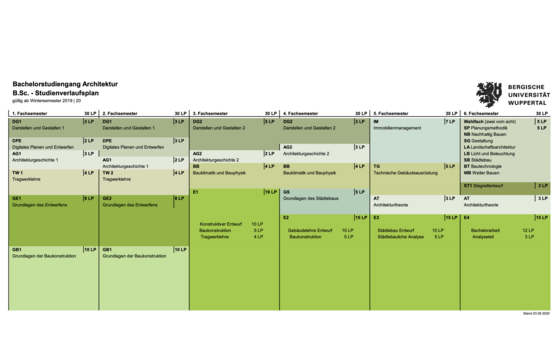 Das Studium der Architektur an der Bergischen Universität Wuppertal beginnt jeweils zum Wintersemester mit dem Bachelorstudiengang. Es hat eine Regelstudienzeit von 6 Semestern und schließt mit dem Titel „Bachelor of Science B.Sc.“ ab. Damit bereitet es auf ein 4-semestriges Masterstudium vor.
