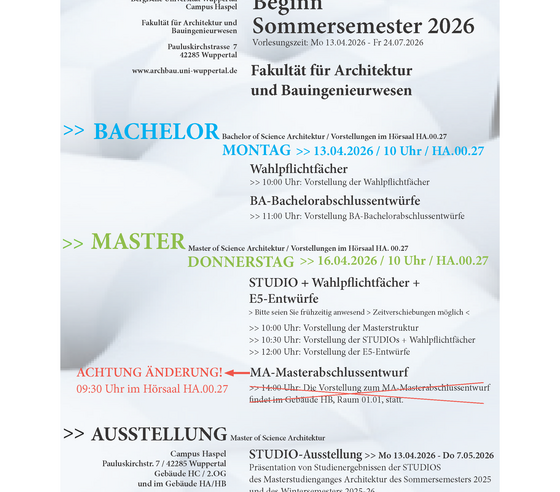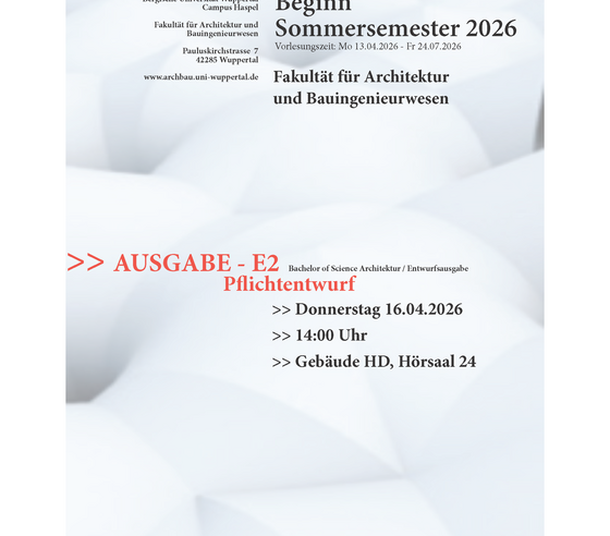 Alle wichtigen Termine und Veranstaltungen zum Start des neuen Semesters, wie Vorstellungen der Masterstruktur, STUDIOs + Wahlpflichtfächer, E5-Entwürfe sowie des MA-Masterabschlussentwurfs finden Sie hier: