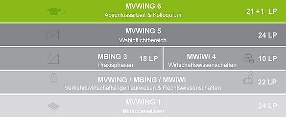 Das Masterstudium im Verkehrswirtschaftsingenieurwesen ist modular aufgebaut (siehe Grafik). In jedem Semester sind 30 Leistungspunkte in verschiedenen Modulen zu erwerben, studienbegleitend insgesamt 120 Leistungspunkte.
