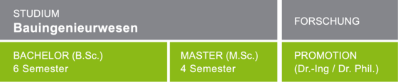 Der akkreditierte Bachelor-Studiengang Bauingenieurwesen - kurz: Bauing - führt in sechs Semestern zu einem ersten berufsqualifizierenden, international anerkannten Abschluss im Bauingenieurwesen an einer Universität („first cycle degree“). Das universitäre Studium eröffnet den Einstieg in eine durchgängige Ausbildung vom Bachelor über den Master bis hin zur Promotion. Dabei können sich schon für die erfolgreichen Absolvent*innen des Bachelorstudiengangs unmittelbare Berufsmöglichkeiten eröffnen. So nutzen einige Absolventinnen und Absolventen die Möglichkeit, frühzeitig in die Praxis zu gehen, um nach einer Praxisphase in der Bauwirtschaft wieder an die Universität zurückzukehren und ihre Karriere mit einem Masterstudium fortzusetzen.