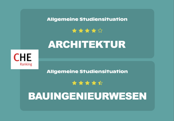 In Deutschlands größtem Hochschulranking erzielten unsere Studiengänge Architektur und Bauingenieurwesen sehr gute Bewertungen. Sie gehören damit zur Spitzengruppe der Universitäten und Hochschulen im deutschsprachigen Raum mit mindestens 4 von 5 Sternen in der Beurteilung der Studierenden.