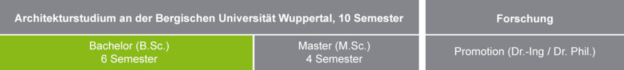 The study of architecture at the University of Wuppertal begins each winter semester with the Bachelor's degree. It has a standard period of study of 6 semesters and concludes with the title "Bachelor of Science B.Sc.". It thus prepares students for a 4-semester Master's program.